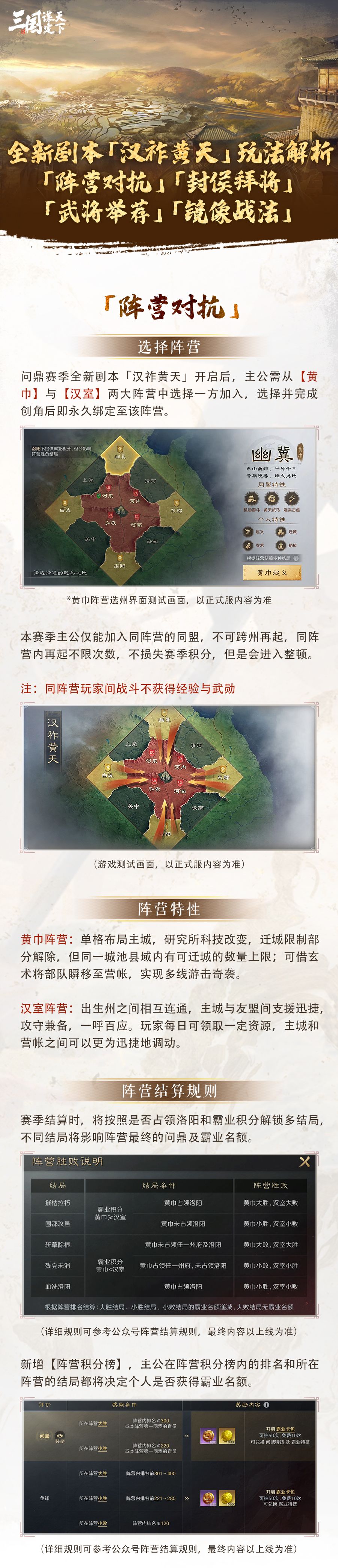问鼎赛季全新剧本「汉祚黄天」丨阵营对抗、封侯拜将、武将举荐、镜像战法玩法解析 本期我们带来的是问鼎赛季全新剧本「汉祚黄天」的玩法前瞻!在后续将登场的新赛季中,主公将在「黄巾阵营」和「汉室阵营」选择其一,亲自书写历史!下面一起进入阵营对抗、封侯拜将、武将举荐、镜像战法的玩法详细内容~