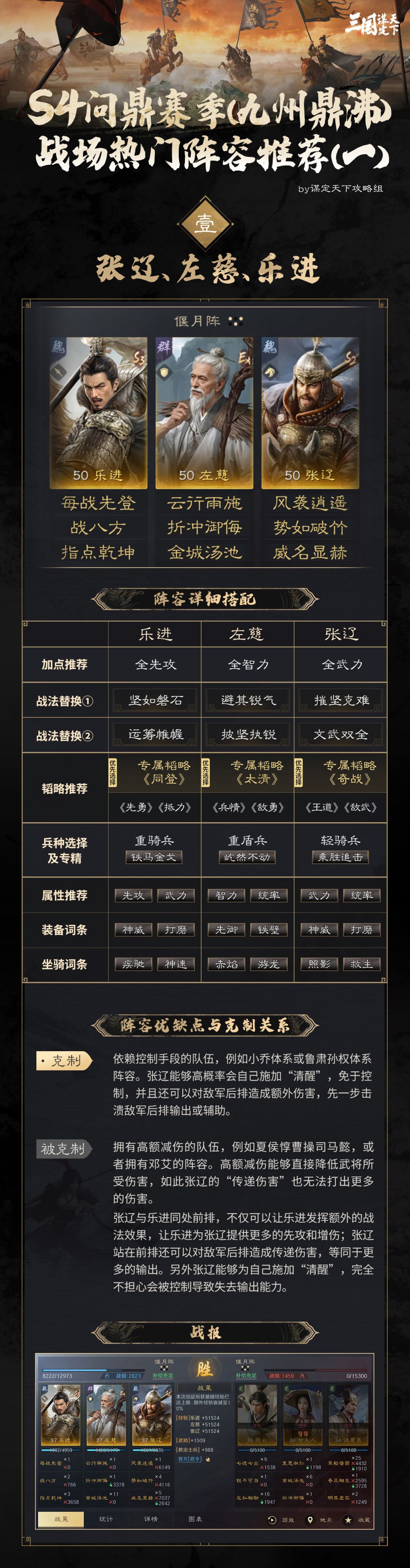 S4问鼎赛季(九州鼎沸)新武将(关银屏、左慈、于吉、曹纯)的加入,给战场环境带来了全新的变化。 为了让大家快速了解当前战场最火热的阵容,本期@谋定天下攻略组将为大家带来“S4战场热门阵容推荐(第一期)”,下面让我们一起看看~ #三国谋定天下 #九州鼎沸 #SLG #三国