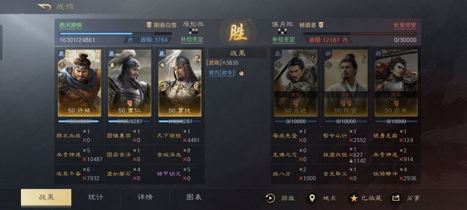 许褚和典韦这对哥俩,在三国谋定天下游戏次元里的命运还真是天差地别。典韦一直都挺火,许褚则长期坐着冷板凳。即便S4过了大半,都开始预热S5的阶段,许褚依旧没能热起来。 特别鸣谢游戏ID名为“西河游侠”的玩家朋友,给本文提供了宝贵的创作素材。他利用麾下的许褚、曹仁和曹纯摆出雁形阵,硬生生用普攻把对面的吕布、乐进和陈宫给剁了呀!这杂牌军的思路实在太清奇,我觉得还是很有必要拆分出来给各位好好复盘一番的。 曹