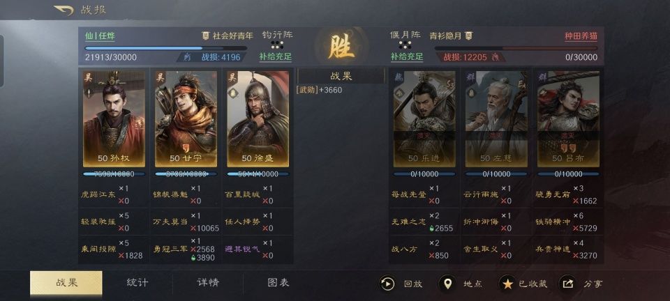 吕布和乐进在前排,左慈在后排的部署,在如今版本的三国谋定天下里,可谓是顶级战队之一了。想要轻松击败他们,并不容易,杂牌队伍就更是送人头的多。不过本文带来的,却是东吴老将们的杂牌军赢下他们的战报。 特别鸣谢游戏ID名为“仙丨任烨”的玩家朋友,给本文提供了宝贵的创作素材。他利用麾下的徐盛、甘宁和孙权摆出钩形阵,三个回合就拿下了左慈做一血,当中蕴藏了哪些亮点,一切且看下文分解! 徐盛战法:百里疑城+任人