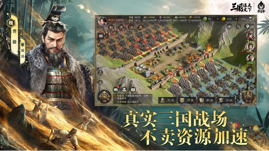 #三国谋定天下创作征集令 - 游戏特色:有镇军、青囊、奇佐等六大职业,各职业天赋与技能不同,可影响补给、战术等,玩家能与盟友配合打出多样战役。游戏不卖资源、加速等,营造公平生态。还具备竖屏模式、自动连地等功能,降肝减负。 - 玩法系统: - 季节轮转:春夏秋冬有不同特性、个人指令和专属国策,季节轮替中还可获结缘信物,对武将施加缘分。 - 阵营对抗:如S6赛季以董卓之乱后的194年