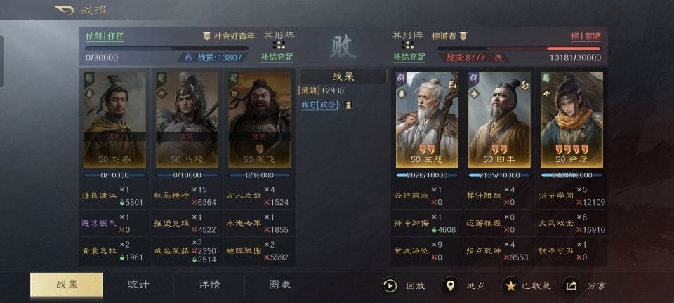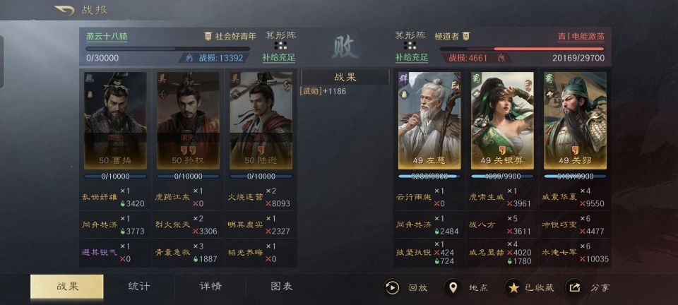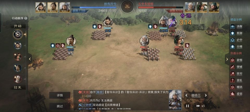 要是问你赵云和关羽谁的武艺更胜一筹,估计你得在自己的脑海里作一番激烈的思想斗争和战力评估。不过换成赵云的前任老板公孙瓒跟关羽比武,我相信你会毫无犹豫的认定后者胜出,哪怕稍微延迟一秒,都是对常识的不尊重。这在三国谋定天下的游戏次元里,也是绝大多数玩家对于公孙瓒和关羽的认知。 特别鸣谢游戏ID名为“秋有月兮”的玩家朋友,给本文提供了宝贵的创作素材。他利用麾下的乐进、公孙瓒和陈宫摆出偃月阵,战斗只打了三