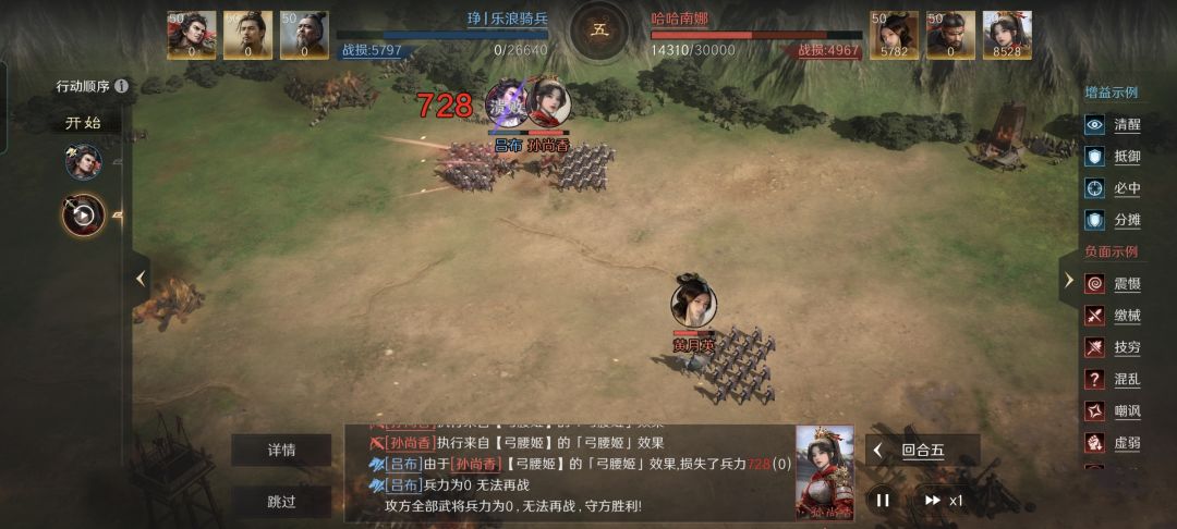 诸葛亮的爱妻黄月英,在当前版本的三国谋定天下里,确实算得上是个相当优秀的奶妈兼辅助。安排黄月英做前排肉盾也不是不可以,然而极少有人会做这样的实践,故而本文要讲解的战报应该在总体上是比较稀缺的。 特别鸣谢游戏ID名为“久思”的玩家朋友,给本文提供了宝贵的创作素材。黄月英、马云騄和马超摆出箕形阵,才跟对面的鲁肃、孙权和陆逊开战一个回合,就双杀了鲁孙二人。 一个巴掌拍不响,独自存活在战场上的陆逊,自然瞬