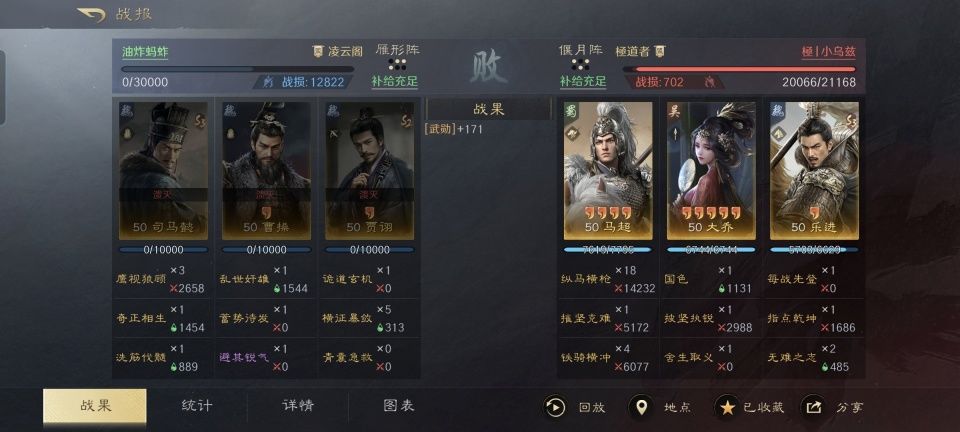 毒士贾诩和狼顾司马懿,在当前版本的三国谋定天下里,还是多少占据着一席之地的。即便面对三仙队,他们也有着可观的胜率。不过相比起来,马超、大乔和乐进的大乐马也颇具实力,本文讲解的,就是一场大乐马以20000残军逆转30000满编毒狼法师的战报。 特别鸣谢游戏ID名为“極丨小乌兹”的玩家朋友,给本文提供了宝贵的创作素材。他的大乐马组合摆出的是偃月阵,3回合之内就抢到了贾诩当一血。具体的思路如何,且看下文
