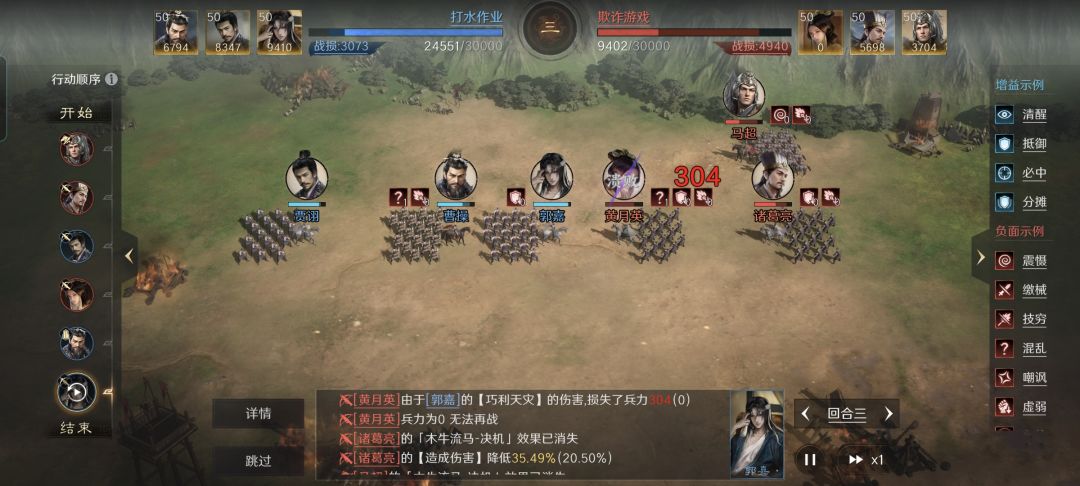 黄月英在前,诸葛亮和马超在后的配置方案,一直以来都在三国谋定天下的游戏次元里极受追捧。本文带来的并非他们如何克敌制胜,而是击破他们的有效办法。 特别鸣谢游戏ID名为“打水作业”的玩家朋友,给本文提供了宝贵的创作素材。打水作业拿出他的曹操、贾诩和郭嘉摆出箕形阵,三个回合就击破了对面的黄诸马,个人认为他的水火天灾耍得恰到好处,接下来就带着各位详细观摩。 曹操战法:乱世奸雄+忘私相助+奇正相生。 韬略库
