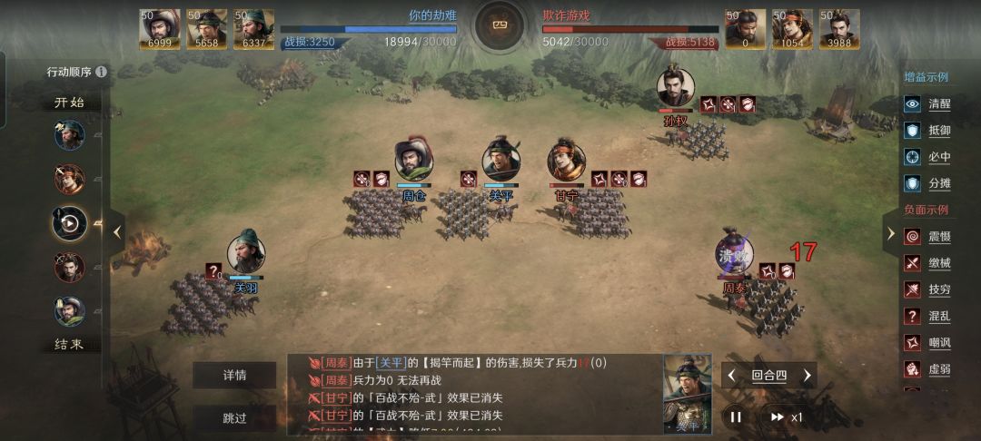 义薄云天这个缘分组合,在三国谋定天下里目前唯一的成员匹配方案,就是关羽、关平和周仓。一旦他们三人同时聚首,就能激发6%的破甲率提升效果。遗憾的是,似乎很少看到这三个角色组成一队。 特别鸣谢游戏ID名为“你的劫难”的玩家朋友,给本文提供了宝贵的创作素材。关羽、关平和周仓三人,在他的部署下摆出了箕形阵,只用了半场时间,就把对面的甘宁、周泰和孙权给全部收拾了。 无论是在游戏里,还是站在历史的角度,那都是