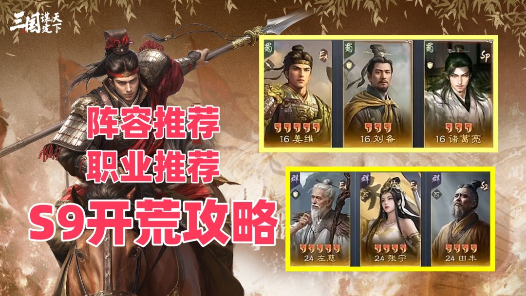 前言:S9开启,率先入驻的玩家们已经进入开荒阶段,结合实战情况,特奉上开荒攻略一份以供参考! 职业推荐:首选司仓,其次是奇佐、天工、青囊,最后是神行、镇军!我们可以闭眼入司仓,后续再根据实际情况进行转职! 阵容推荐:先来说人气较高的两队1.薪火枪(姜维+刘备+SP诸葛亮) 它适用于整个开荒阶段,尤其是打9级10级地开始效果显著,缺点是战损相较其他队伍来说要高! 该队伍采用雁形阵,姜维战法带胜敌益强