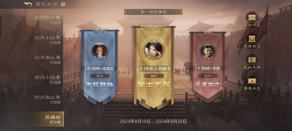 真心建议大家没事多去看看演武大会的英雄榜,无论对于PVP还是开荒,其实都有非常大的借鉴意义。本期展示的是8月19日到8月26日的英雄榜,让我们看看头三甲分别花落谁家。 恭喜来自小猪佩奇同盟的侠影乄测抽卡,来自浪浪山同盟的御林丨虞海宝以及来自倾城同盟的倾城丨非酋夺得了本期的演武前三。接下来,就让我们从第三名开始逐步梳理,处于巅峰的九支队伍分别是如何配置的。季军倾城丨非酋的三支队伍分别是甄洛队、赵云队