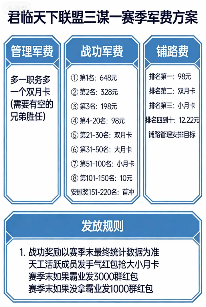 君临天下联盟 三谋一赛季军费方案一、管理军费多一职务多一个双月卡(需要有空的兄弟胜任)二、战功军费① 第1名:648元② 第2名:328元③ 第3名:198元④ 第4–20名:98元⑤ 第21–30名:双月卡⑥ 第31–50名:大月卡⑦第51–100名:小月卡⑧第101–150名:10元安慰奖151-220名:首冲铺路费排名第一:98元排名第二:双月卡排名第三:小
