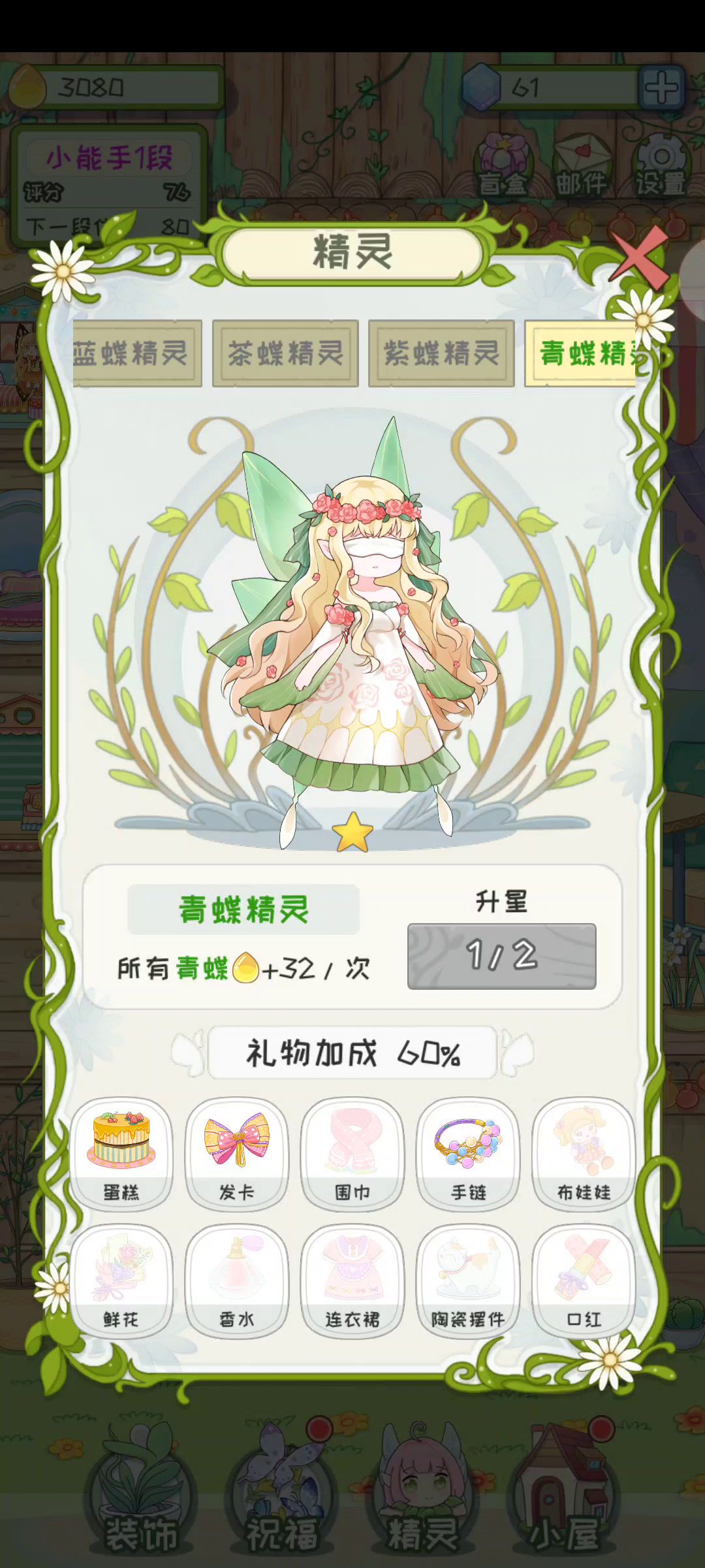 今天测了可爱画风的养成新游,七月九日刚上线的代号蝶,初次打开页面,直观感觉的就是,这款游戏有点小女生游戏的感觉,蝴蝶可以进化成精灵,而且还有一些蝴蝶可以采蜜,这虽然刨了蜜蜂的活,但是处于游戏完整性,也可以接受,这里面除了花蜜之外,更有价值的就是这个碎片,有了它可以解锁精灵小屋等,此款养成类游戏另一个主打项目是绿植养成,小屋布置,随着等级的提高,绿植和外景升级需要的花蜜越来越多,这里不得不提的是挂机花蜜收集,这里做了一个测试,平均来说两个小时能获得1574点花蜜,配合罐子里面赠送的花蜜,差不多,两个小时有一千点花蜜,和同类养成游戏相比,升级较慢,我计算了时间,差不多三五天,就可以玩到熟手级别,这个游戏给人的获得感还行,作为养成游戏中规中矩,亮眼的地方不多。