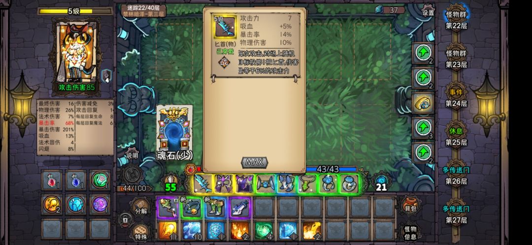 开局要刷个吸血武器,不建议拿剑,剑金了以后吸血减半,血量会跟不上。 前期主要是升武器提高吸血,其他装备全部升出第一条属性保证续航。 挨过了30层,可以开始点特殊,卷轴基本可以all in了,全拿加属性的徽章。基本到了这里后面就是乱杀了,没有什么威胁。 中间闪避怪,先直接打一两个,剩下的火球术点;打BOSS,第二轮BOSS攻击前硬吃,第二轮攻击冻,第三轮攻击冰盾,有神佑就神佑