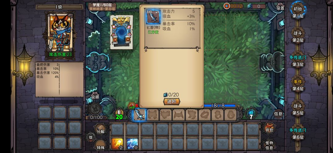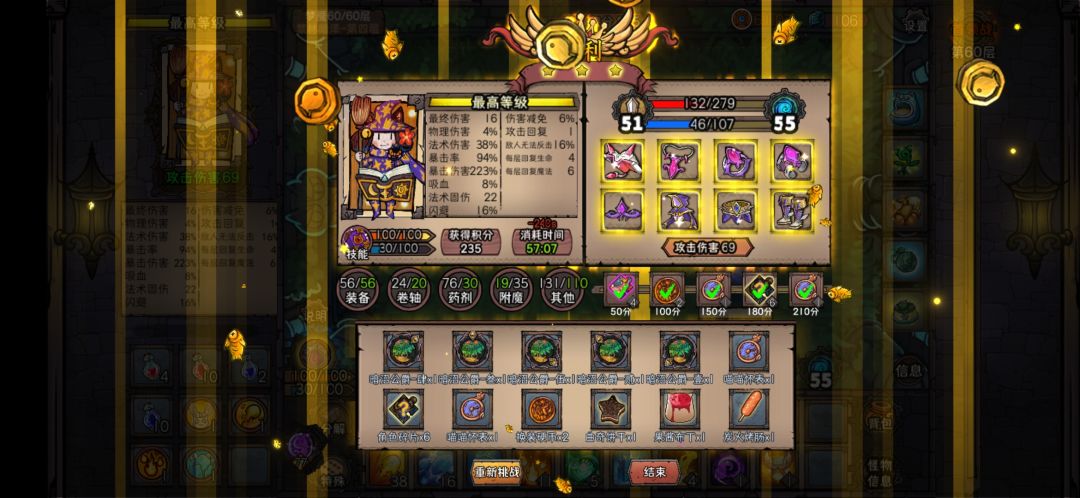 开局要刷个吸血武器,不建议拿剑,剑金了以后吸血减半,血量会跟不上。 前期主要是升武器提高吸血,其他装备全部升出第一条属性保证续航。 挨过了30层,可以开始点特殊,卷轴基本可以all in了,全拿加属性的徽章。基本到了这里后面就是乱杀了,没有什么威胁。 中间闪避怪,先直接打一两个,剩下的火球术点;打BOSS,第二轮BOSS攻击前硬吃,第二轮攻击冻,第三轮攻击冰盾,有神佑就神佑