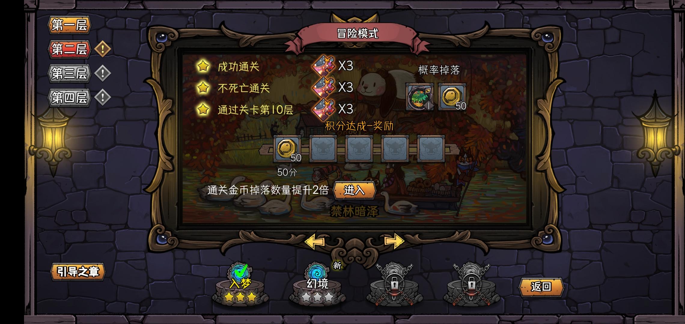 这游戏感觉有点像以前玩的冈布奥。现在打到了第二层,就是一把能送两个人物碎片加一个参战碎片的。感觉这个养成系统有点问题啊,你们自己肝过么,一把三个碎片,猴年马月才能把人物强化肝出来?而且出战碎片还得看积分,积分里面看你剩下多少药和卷轴,很大可能就拿不到那个出战碎片。。。太坑了。我第一层快打完了人物就点了第一点。。。这个游戏上手建议刷个好武器,没有吸血和打回分分钟弹尽粮绝暴毙。。。另外装备就靠