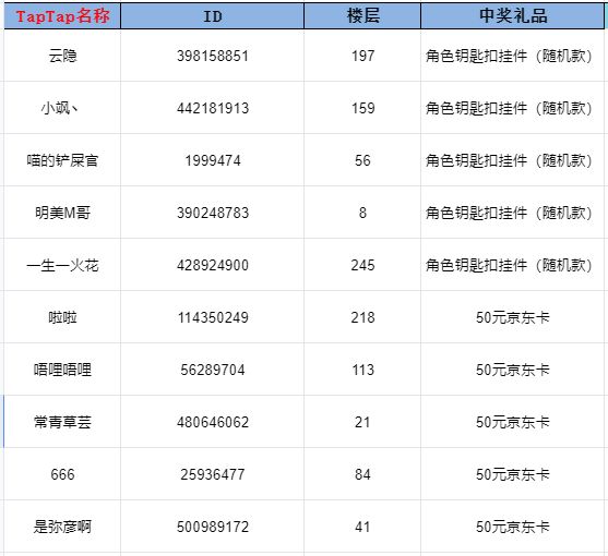 大家好呀,之前发布的中秋节预约祝福活动已结束,感谢大家的热情参与~事不宜迟,马上来公布中奖名单吧!活动原帖:以下为《卡牌迷境》中秋节预约祝福活动TapTap中奖名单:恭喜以上10位玩家!!!领奖方式:请中奖的玩家请添加《卡牌迷境》官方群613119472,找管理员“凌编二号机”进行领奖,届时需要提供【TapTap账号截图(位置在-设置-账号与安全)】和【中奖楼层截图】及【前来领奖当天的