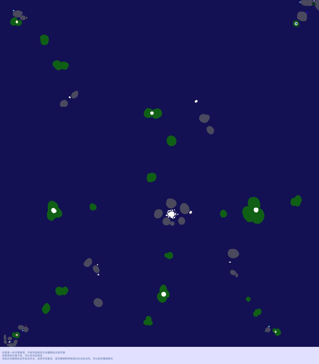 第八关实在太大了,很容易迷路,索性就把地图推测出来了,因为只是推测实际距离肯定会有误差,但大致方向是对的,但愿能帮到卡在第八关的小伙伴 注意事项: 左下白点带箭头的为我们,即出生点,其余白点为白鱼 解锁粉花会有仙女鱼来引路,但只会帮你找到白鱼白花,四色花需要自己找,右上的荆棘需要打开四色花才可以解锁 白花全部开启中心会开启过关点,但不触发下一关动画,解锁的荆棘游过头也会过关,会触发下一关动画,