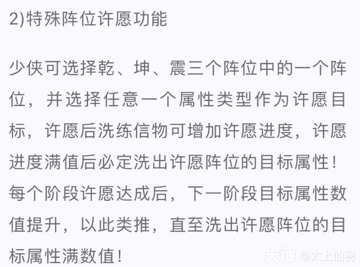 本攻略为玩家太上仙羽经验分享,仅供大家参考,不代表官方观点。 6月,系统维护开发了“特殊阵位许愿功能”,让玩家完美激活阵法变的非常简单。 此功能虽已开放了三个月的时间,小伙伴都知道许愿流程,但大多数小伙伴却对许愿涉及的问题不清楚,万一试探错误就亏大了(毕竟是需要浪费物资的事儿)。 关于许愿阵法及相关问题进行统一回复,便于系统性了解和日后查阅。 1.正常洗练特殊部位与许愿的差别 正常洗练出特殊部