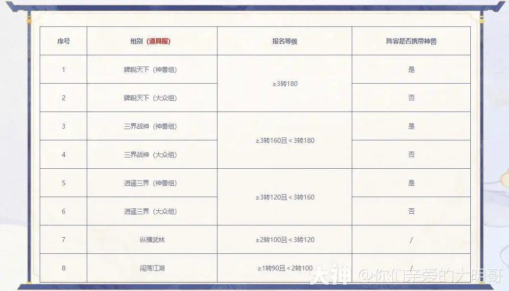 本攻略为玩家经验分享,仅供大家参考,不代表官方观点。 大话西游手游第二届【召唤兽比斗争霸赛】将于2月22日开启报名,26日开始海选赛。和第一届相同总奖池30万保底,赛事不仅划分了参赛等级组别,三转后玩家更是细分为了神兽组与非神兽组,共计8个组别让不同层级的玩家感受到全民赛事的乐趣! 说明一下,高等级组别中设置【神兽组】【非神兽组】的分组维度,分别要求“阵容中至少拥有一只神兽”或者“阵容中不拥有神兽
