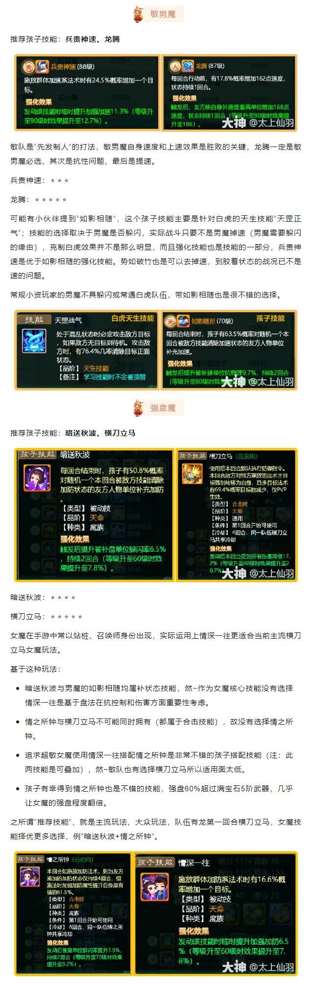 本攻略为玩家经验分享,仅供大家参考,不代表官方观点。 从最初的生、培养,到现在技能实战效果,养育系统已经是很成熟的系统。 此贴就是再梳理一下孩子技能的那些事儿,让思路更清晰的去选择适合自己需求的孩子技能。 科普 孩子培养过程会获得不同技能,获得的技能会落入命盘;在孩子结局时,会从命盘中随机选择3个技能落入战斗格;而战斗分为“天、地、人”3个格子,每个格子能落入的技能分别对应“种族技能、通用技能、