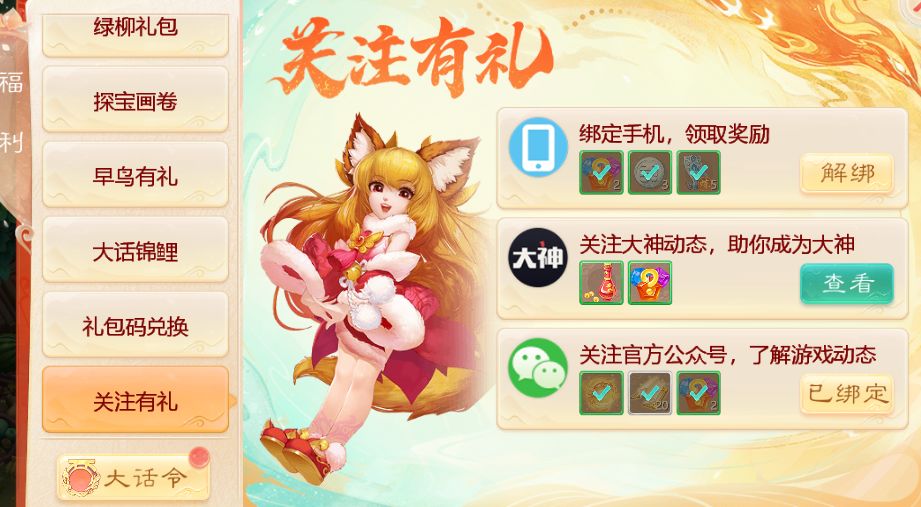 【省钱妙招】 本攻略为玩家经验分享,仅供大家参考,不代表官方观点。 1、铁蛋重点提醒:游戏页面左侧的福利入口,找到关注有礼,目前可以绑定手机,可以获得宝石,师门贡献以及中级炼化符。 以及绑定网易大神,除了绑定的奖励外,每天签到还可以获得不同的奖励,少侠们不可错过。 最后也别忘了绑定公众号,可以获得凝魂丹,伙伴修炼册,以及宝石。 2、任务所得和大雁塔积分兑换的珍稀神兽属性卡,在长安水陆帮战前一小时上