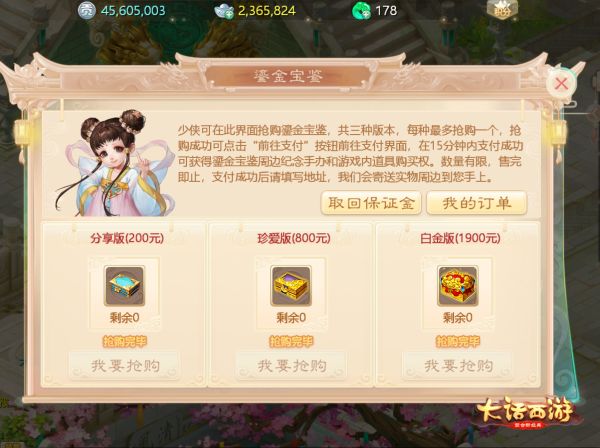 龙兔萌力爆棚,宝鉴3秒售罄!被称为大话手游史上最萌的2019鎏金宝鉴今晚正式开抢,三界侠士们早已蓄势待发,今晚19:00第一批鎏金宝鉴正式开始售卖后,仅仅3秒就已售罄!典藏好礼,限量珍藏,不知各位少侠是否已如愿将超萌龙兔召唤兽迎回家?3秒售罄!鎏金宝鉴首批抢购状况火爆今年的鎏金宝鉴全面焕新,每一件都是匠心打造,充满收藏价值。此前,在大话手游中预约抢购资格的场面就相当热烈火爆,今晚更是摩肩接踵、