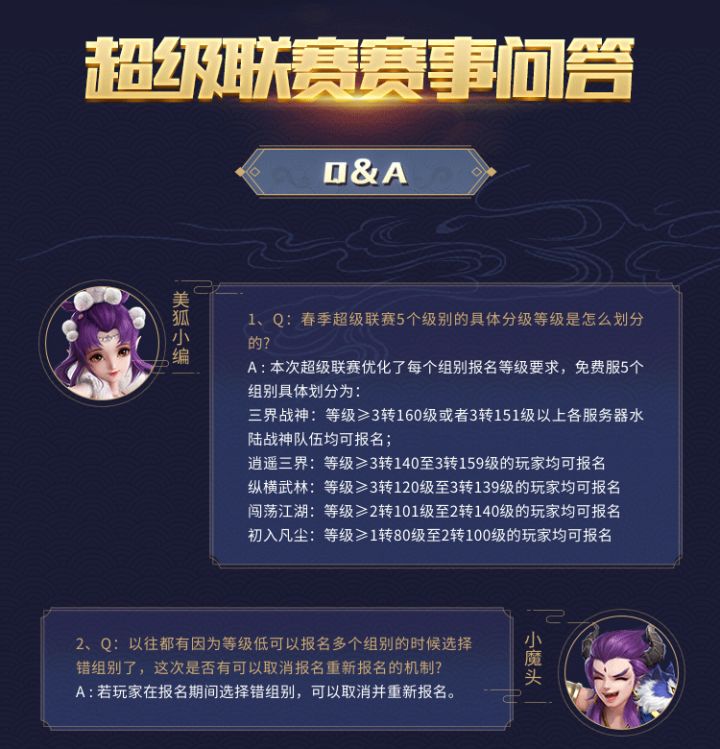 龙腾虎跃聚群雄,五湖四海会英豪。《大话西游》手游龙争虎斗超级联赛即将火热开启,作为大话玩家热爱的竞技赛事之一,今年的超级联赛将全面升级,为大家带来贯穿全年的精彩赛事体验!为了帮助大家能够顺利在本次龙争虎斗超级联赛取得好成绩,在正式鸣锣开赛之前,大话为大家带来了详细的超级联赛Q&A,先来了解一下关于超级联赛的各种信息吧!蓄势待发!春季赛报名需知本届龙争虎斗超级联赛春季赛将于4月底至5月进行,具体