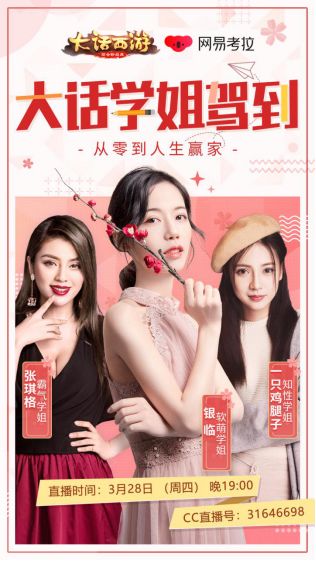 喜迎开学季,学姐亲授课。今晚,《大话西游》手游开学季直播活动登场,三位大话学姐将来到大话直播间,亲自开堂授课,并现场为大家带来精彩表演和趣味互动,直播期间玩家参与抽奖就有机会获得爱奇艺月卡、夜溪灵手办等豪华实物奖励,更有超豪华金条大奖等待你来赢取!直播地址:http://dhxy.163.com/2019/kxj/dhxjtdt.html人生赢家何处寻?大话学姐来答疑!青春须早为,岂能长少年