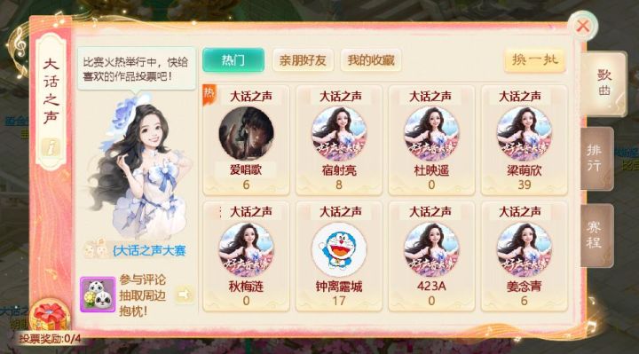 【维护预览】【好声音大赛 火热来袭】音缘四起,蔚你圆梦!首届好声音大赛即将开启报名!争当大话情歌王,让你的声音传遍三界!1)报名时间:8月31日维护后-9月7日5:00;2)使用已经录制的好声音歌曲即可登记进行报名,尝试新主题曲《永生所爱》有机会获得惊喜礼品哦~3)话题广场同步开启活动,参与发布参赛歌曲话题可以在投票阶段转化为人气值;同时参与评论话题还有机会抽取周边抱枕!4)投票环节将