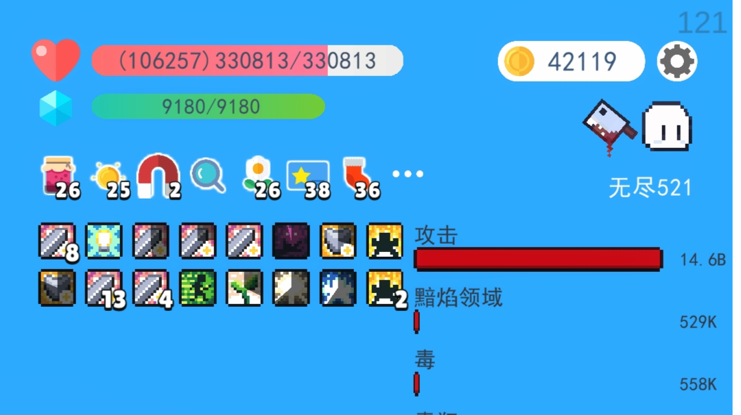 武器是“海盗弯刀” 帽子是“丛林头巾” BOSS技能首选秘银锤,没有的话,可以选择暴击给盾,和攻击给盾。 人物技能,我一般都是吞噬壁垒或者诅咒术(全体减伤防止低血量时被秒)加9级圣体,双壁垒没有太大必要性,可以弄个剑魂觉醒配合双重觉醒更佳,然后必不可少的电力味糖,狂化也很需要因为他可以不被击退和加吸血,风力全开也可以,近战对速度还是要点要求的,跑得快攻击就频繁,也不至于被远程放风筝。(拿个15速度的小鞋子其实也够) 从几百飙一万多,怪无限来,就无限杀,近战只要理解到位比法师稳多了
