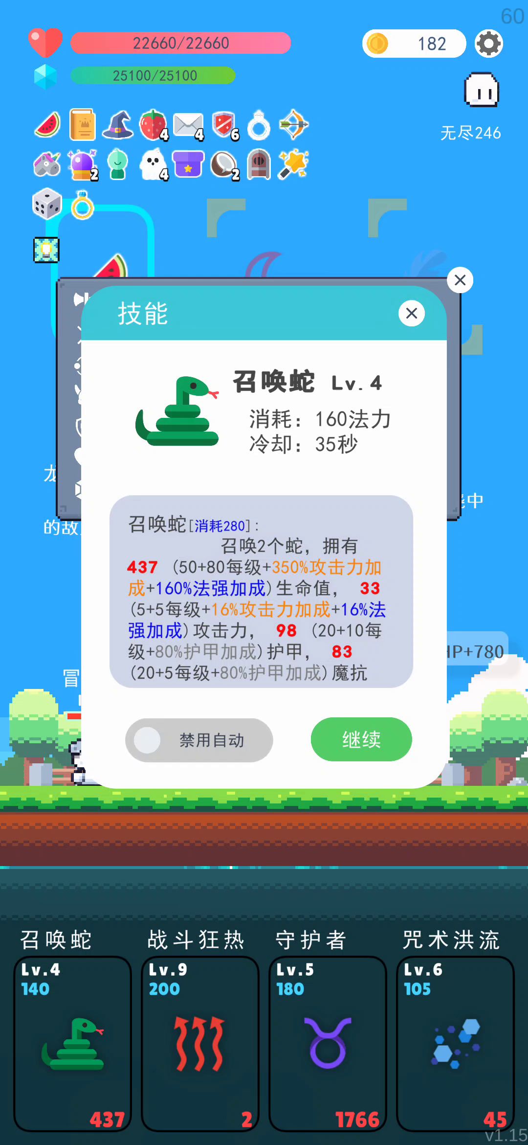 主要改动思路: 之前一个版本主要配置了几个重要的基础功能,结果用了很长的时间却没有给大家带来全新的游戏内容,当时答应大家一定在暑假前搞出一版强大的内容更新出来,好家伙这不就来了吗(虽然有点久)。 最主要的产生最多bug,用了我最长时间的,当属技能强化,现在技能在升级后会变得更加强大,彻底解决了有些技能过于垃圾导致选一级剩下的选属性的窘境,然后由于技能的属性多元化,让更多的组合成为了可能。 内容改动