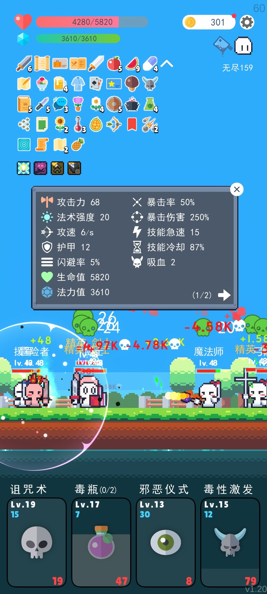写一下毒的套路 首先以现在版本的强度,毒套的杀伤力是非常强的,不会刮痧。 毒的技能 有四个,毒药,诅咒,毒性激化,宿主。我们的技能栏只有四个,加上自动吞噬的圣光,和主动吞噬技能,一共6个。 圣光,奇迹魔法(减cd神技),魔法防护(保命技能)这就占据了三个。剩下的选择毒药(有精品物品 粘性毒药加持强的一批),毒性激化(伤害比宿主高,估计现版本怪物强度不够,到不了宿主的斩杀,怪都死完了,而且这个技能还带巨额的盾 )最后一个选择诅咒或者双魔法防护或者双cd时空压缩。 属性就是法强,cd为主。 物品 剧毒蝙蝠这个好拿,粘性毒药,秘密寄生都是神器。回蓝多来点了,最好是挨打回蓝或者杀敌回蓝。 技巧主要是前期越早越好的拿到魔法防护,直接20关吞噬了,如果前20出了诅咒,也可以吞诅咒,慢慢养魔法防护。 装备常规套,月光,蛇冒