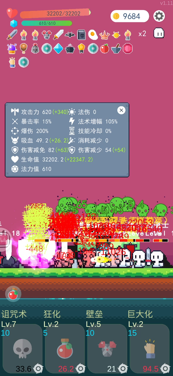 初始:老皮+回血刀 +诅咒术(我们需要的是20%的减伤) +双壁垒(女神吃一个,再拿一个) +壁垒道具(壁垒每级带来额外的1%减伤) +水晶球(技能效果增加5%) 效果如视频所示,建议像这种流派可以拿一个剧毒蝙蝠,以防攻击力不足时遇到双牧师而卡关的情况发生;而视频中的加血道具,是为了保证回血的充足(虽说敌人的攻击已经被削弱到700不到了,但小心驶得万年船)