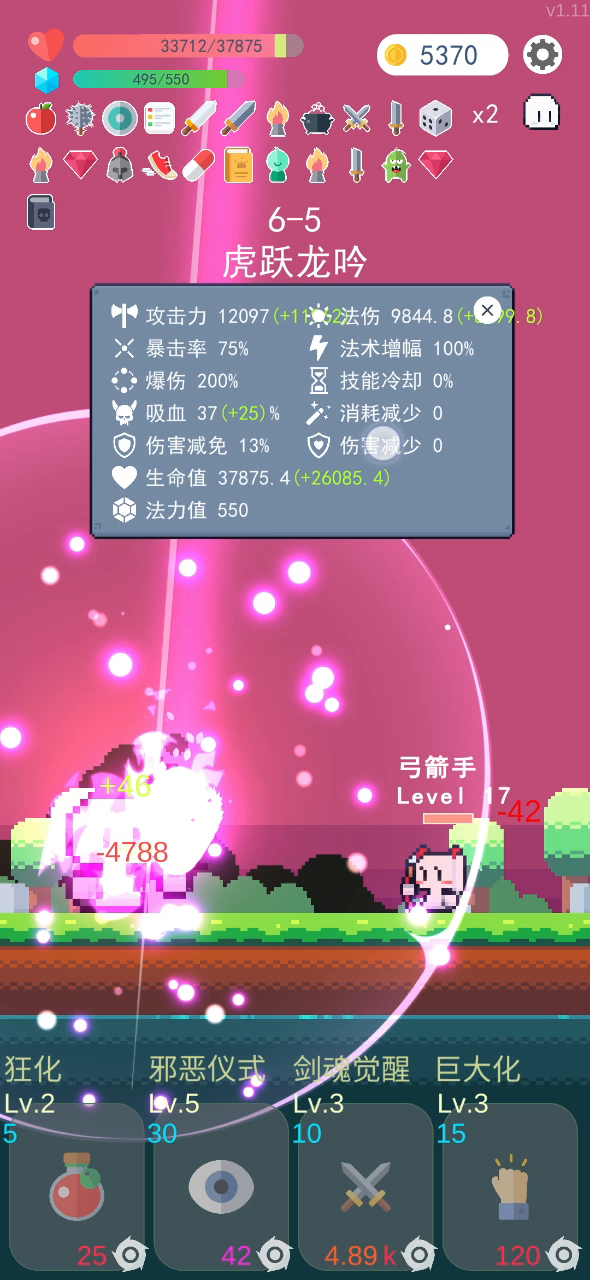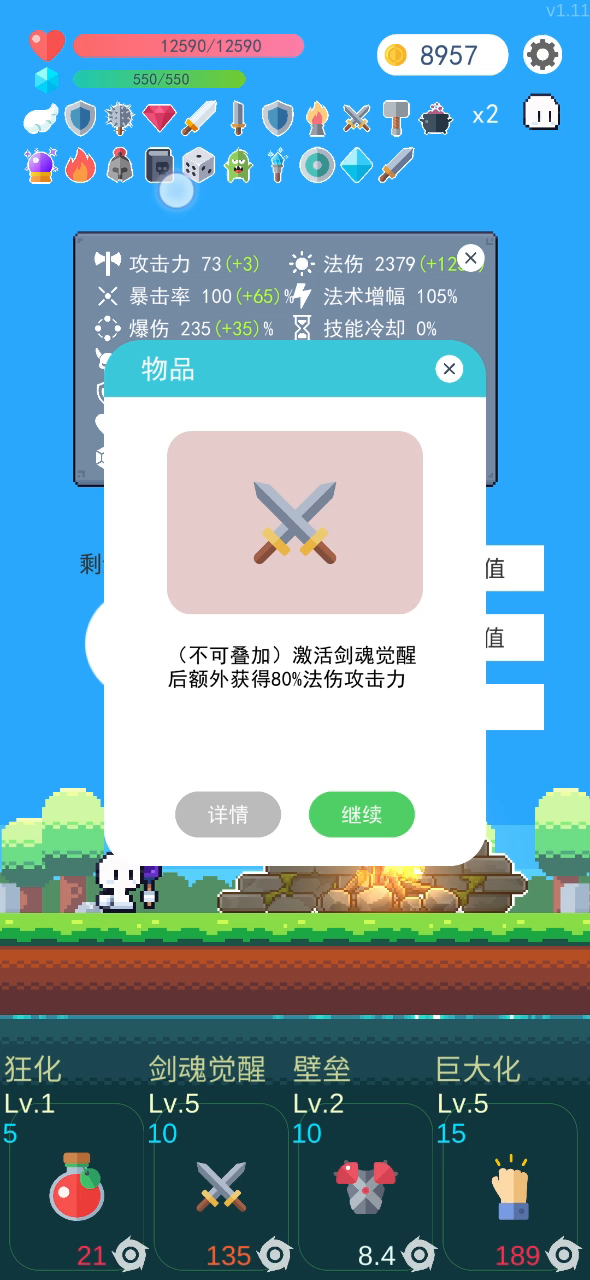 +开局狂刃+粗糙皮肤 +双血钻(血量10%增加法伤 *2) +觉醒之刃(法伤80%增加攻击力) +便签(命中敌人后按攻击力5%增加护盾) +巨人、邪恶之眼、狂化 +双剑魂觉醒(女神雕像3000吃一个,再拿一个) =至高无上的攻击+血量+护盾 (爽!)