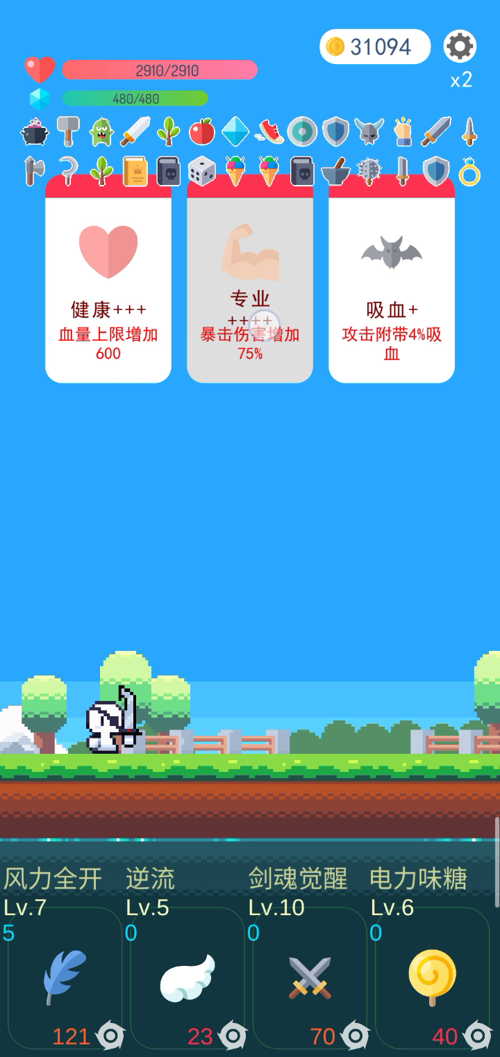 最强套路无限剑气 防御靠魔法盾,专职都选中间,攻击回蓝,和减CD收益加倍,被动也选减CD。达到主动技能无CD瞬发。输技能首选剑气可触发平A效果。其他任意输出技能都可以通关。但是没剑气爽。