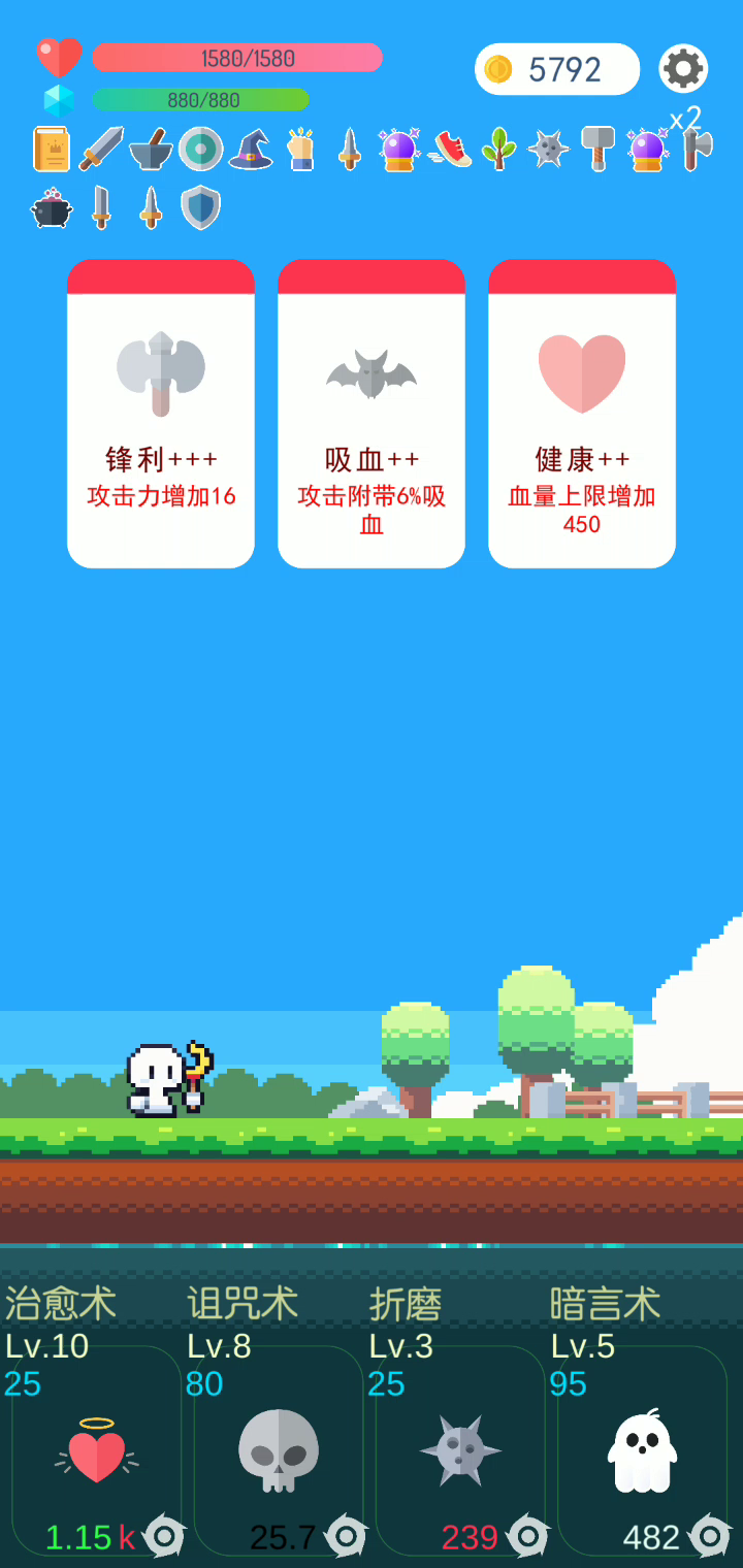 帽子带受伤回蓝,武器没开几个,随便。技能选图中的,劈斩可以换成加生命值百分比攻击的那个手臂。buff选蓝耗缩减或者道具,缩减到为0就行,有些道具合适了就很有用,所以尽量要多点道具。劈斩可以把近战的敌人踢远点,这样可以接近对方的远程一起打,然后基本就无敌了。前期可以不要反甲,要回血也行,到后面再换。