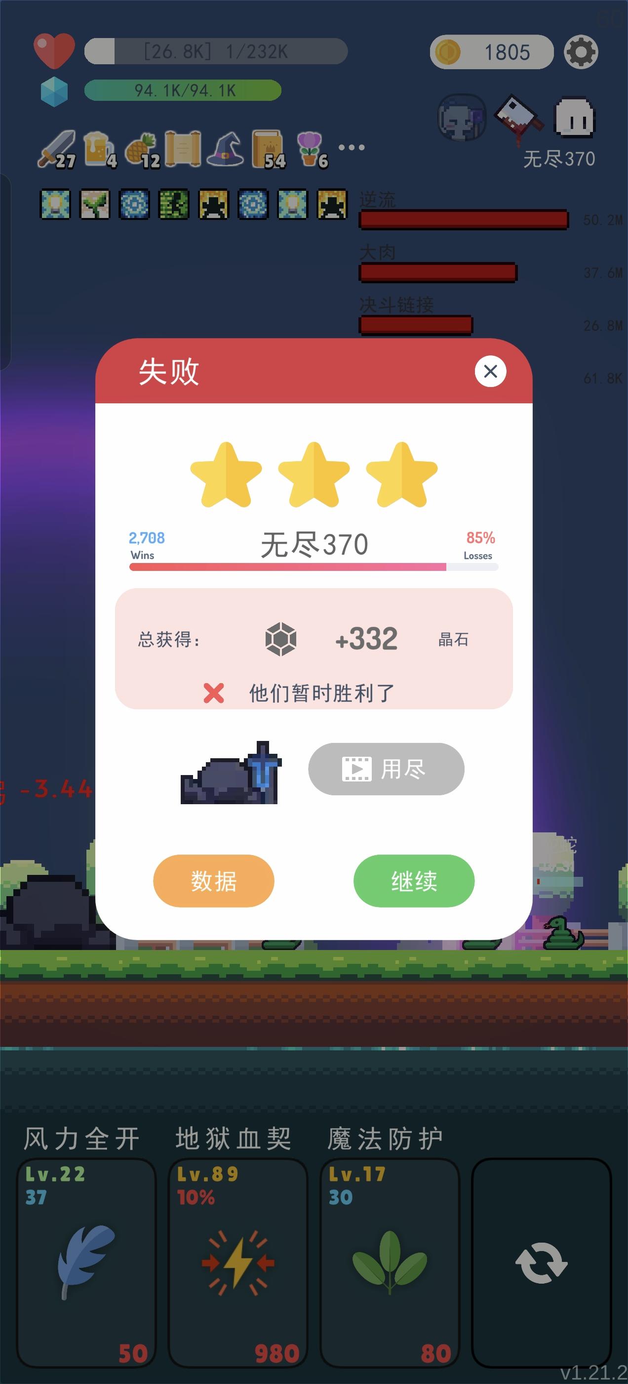 看到我的技能了吗?用这套技能可以200层以后,但是从200层开始就开始卡了,不知道是游戏还是手机的事,我的手机是三星24u,配置也还算可以,这个游戏也不大,就是这样,无脑到200层我一看死不了就把技能换了才结束游戏的。手机都热了,烫手了