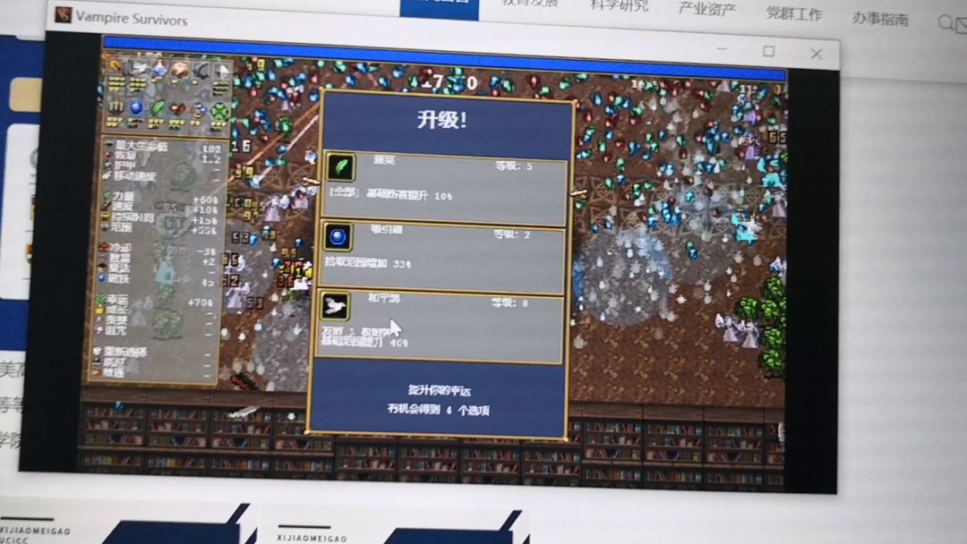 武器进化要组合的,网页版不知道到那个阶段了,但是你这里飞刀配护腕,圣经配连接器,斧头配烛台升的级,其他的符文追踪器配护甲,大蒜配番茄,火焰之杖配菠菜,四叶草配十字架,空白之书配法杖,复制器配闪电戒指。武器到8级之后有对应被动才能升级