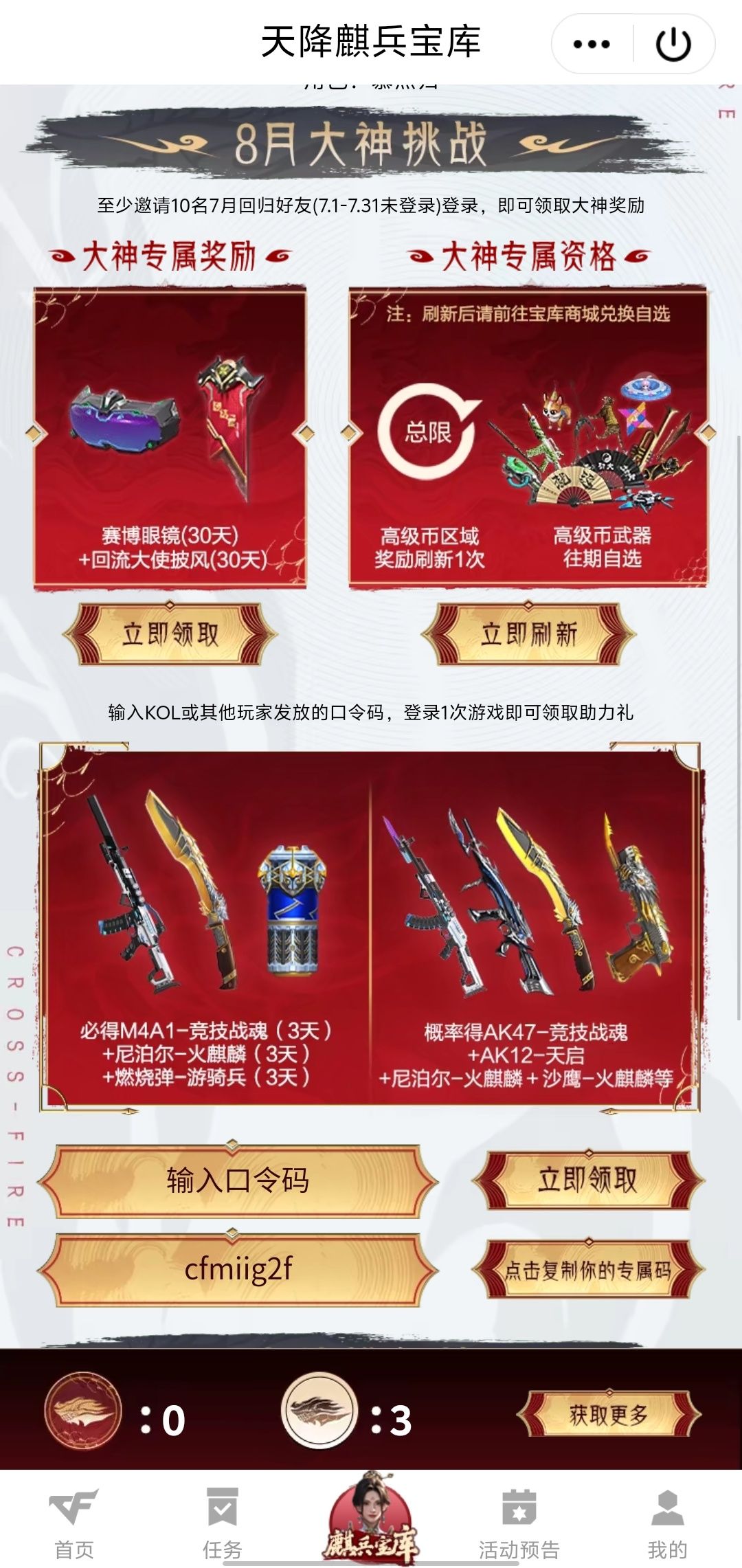 兑换码:cfmiig2f 八月宝库,七月未登录老兵或新注册玩家输入兑换码必得永久武器#欧皇附体 #穿越火线枪战王者 #游戏日常 #穿越火线枪战王者攻略 #游戏攻略 #