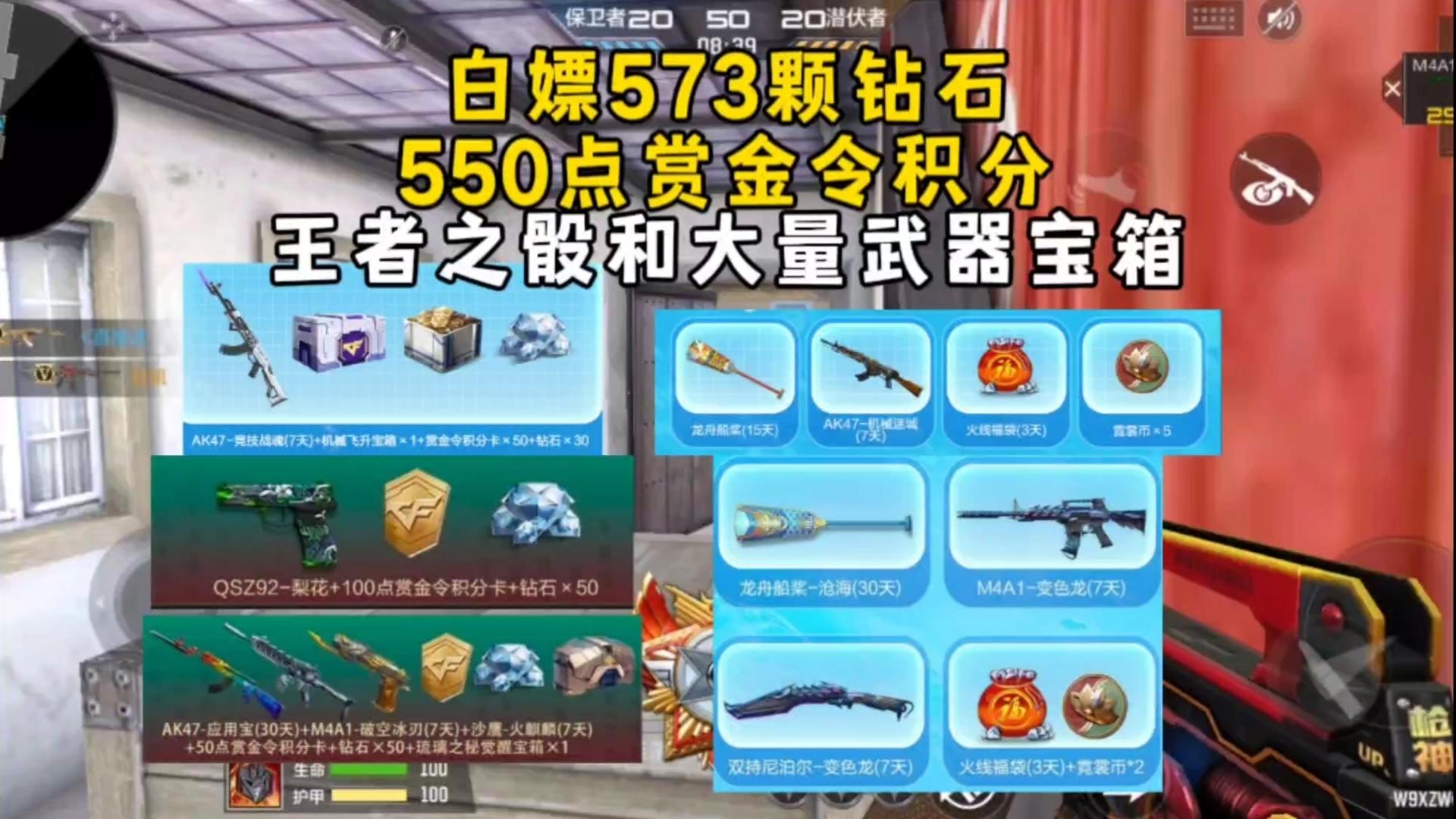白嫖573颗钻石和550点赏金令积分,王者之骰和大量武器宝箱