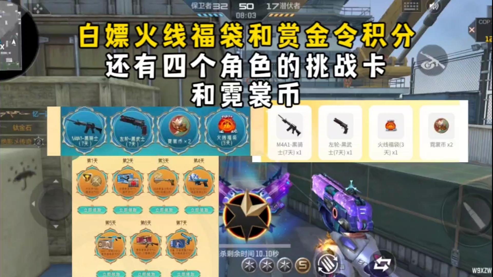 白嫖火线福袋和赏金令积分,还有四个角色的挑战卡和霓裳币!