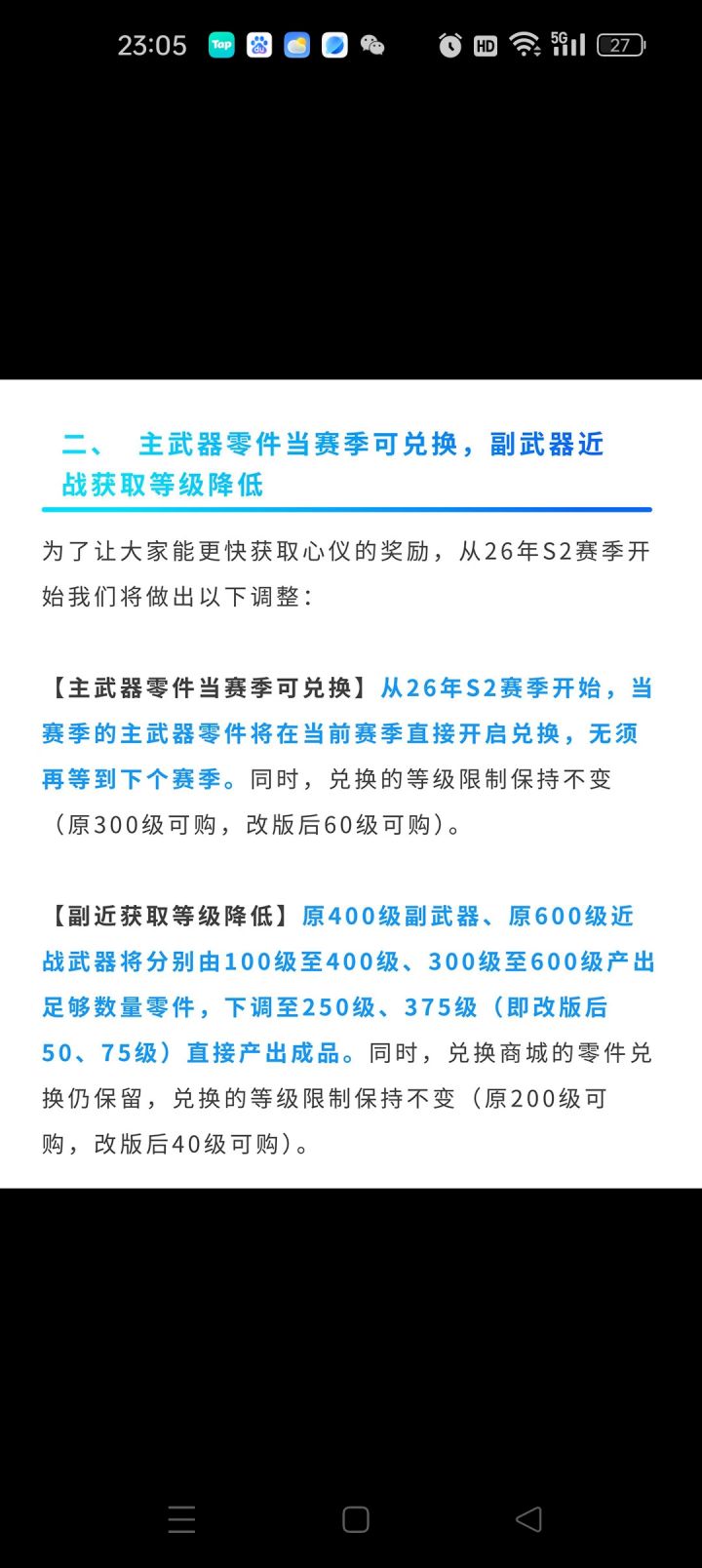 🎮 《CF手游》赏金令S2赛季大改,等级比例压缩 昨日,由韩国Smile gate研发商授权、腾讯天美工作室群研发的第一人称射击类手游《穿越火线:枪战王者》发布策划公告,2026年S2赛季赏金令将迎来重大优化调整 本次调整核心为等级比例压缩,按5:1比例将等级线压缩,升级规则从100积分提升1级改为500积分提升1级,但核心奖励不变,赛季大奖可直接兑换,让等级查看更加直观方便,同时将增加钻