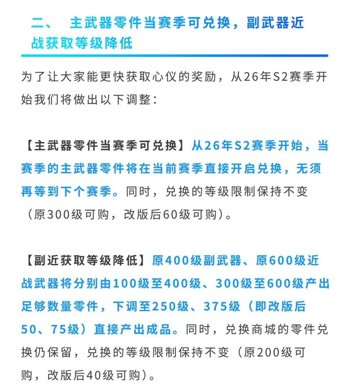 CFer们注意啦!2026年S2赛季赏金令将迎来重磅优化,核心围绕“减负”与“提速”展开,具体调整如下:📊 等级压缩,奖励不变新赛季等级将按 5:1 比例压缩(如原200级变40级),积分获取规则同步调整为每500积分升1级。放心,核心奖励总量不变,且原C4工具钳奖励替换为 4000钻石,血赚!🎁 毕业门槛降低主武器:当赛季零件当季即可兑换,无需苦等返场。副/近战:成品获取等级大幅下调(