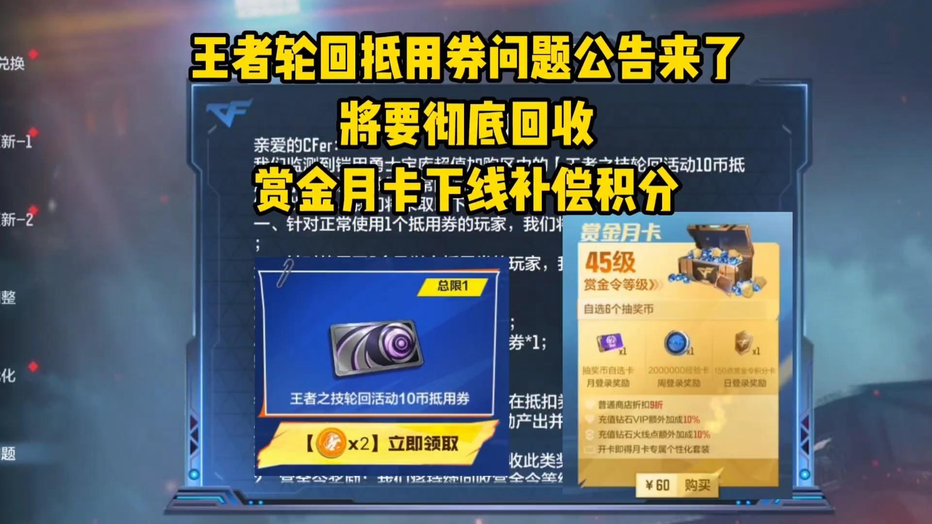 王者轮回抵用券问题公告,将要彻底回收,赏金月卡下线补偿积分!