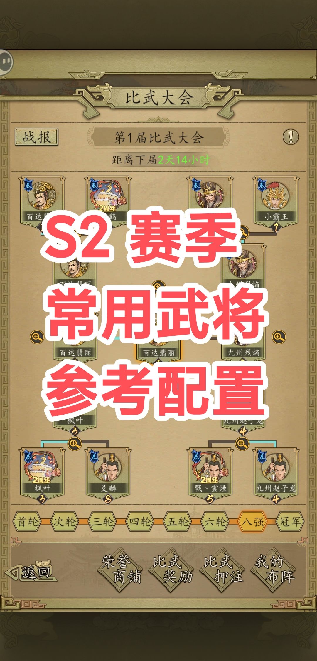 s2赛季是一个不成熟的赛季! 打架运气几率比较大,但此篇是位氪金玩家所列阵容图,此篇不是让你s2怎么打!此篇只是让你看一下s2赛季大家目前的现状,从而找出克敌武将阵容! 同时适合新手对s1赛季的选将、每日五次武将切磋避免刷新有较大帮助,新手可直接抄作业,为新区武将配置指明了方向,由于s2赛季不成熟,建议大家在s3/4/5/6赛季篇幅中对比研究新区通用最强武将,以便少走弯路,选出以一敌十、由s1直通
