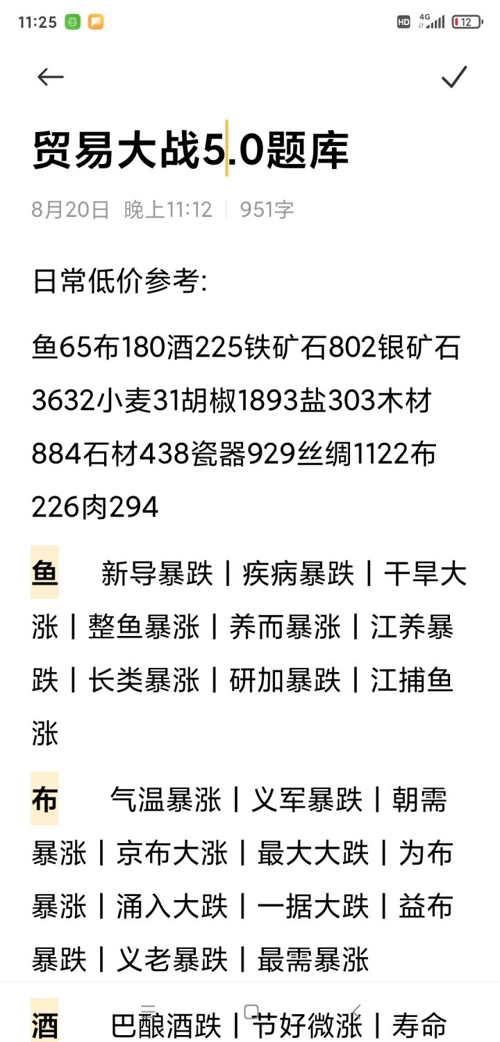 日常低价参考:鱼65布180酒225铁矿石802银矿石3632小麦31胡椒1893盐303木材884石材438瓷器929丝绸1122布226肉294【鱼】 新导暴跌丨疾病暴跌丨干旱大涨丨整鱼暴涨丨养而暴涨丨江养暴跌丨长类暴涨丨研加暴跌丨江捕鱼涨【布】 气温暴涨丨义军暴跌丨朝需暴涨丨京布大涨丨最大大跌丨为布暴涨丨涌入大跌丨一据大跌丨益布暴跌丨义老暴跌丨最需暴涨【酒】 巴酿酒跌丨节好微涨丨寿命