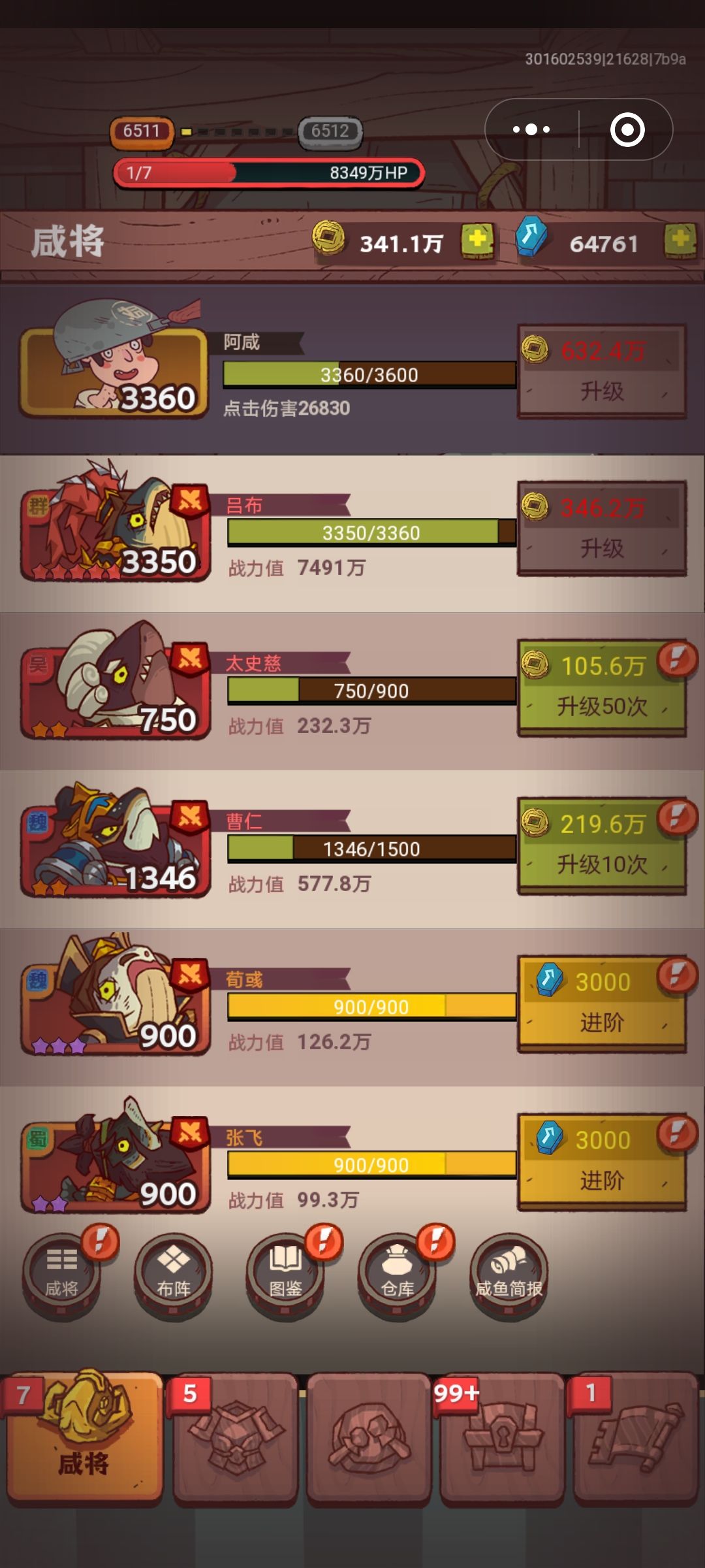 6510 周瑜,吕布红五,7491万战力 过关阵容:吕布 太史慈 张飞 荀彧 曹仁+无火把 感觉曹仁的冰冻触发会更高,连续控制几轮就通关了 期间试了以下阵容: ①吕布 太史慈 张飞 荀彧 庞统+咸神火把 ②吕布 太史慈 张飞 荀彧 黄月英+咸神火把