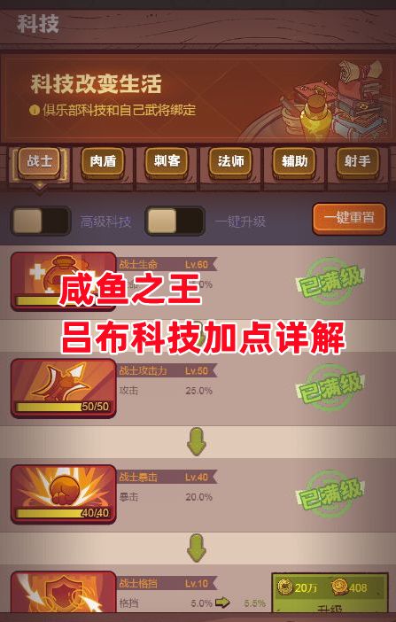 本文首发【咸鱼王攻略组】公众号,未经授权禁止“抄袭文章”转载至其它平台。 哈喽各位小伙伴,我是小咸,俱乐部科技怎么加点?科技加点是游戏里战力拉开别人重要因素之一,今天小咸给各位小伙伴带来战士吕布科技加点建议,一起来看看吧~ 一般来说俱乐部科技加点是都要点满的,只是先后的问题,因为一时间拿不到那么多军团币。 由于科技加点要点到10才能点下一个,除了格挡和速度只需要加到10,其它的点满。 优先把攻击和