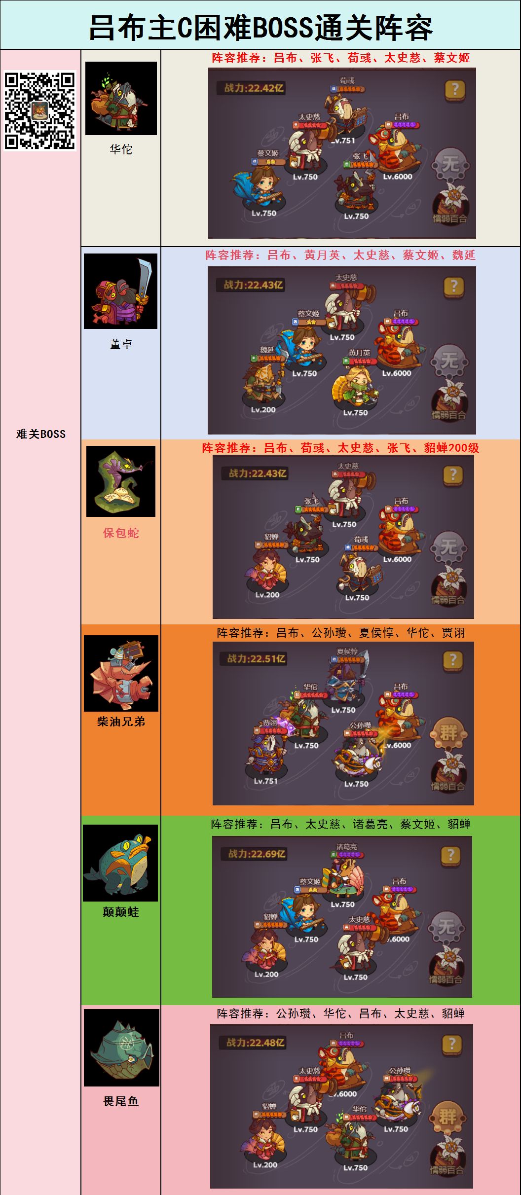 首发 前言 大家好,我是猫叔。更新一下之前吕布的推图攻略,基本上吕布会卡的推图关卡都有推荐阵容,希望对大家有所帮助。 01常规通用推图阵容 常规通用推图阵容第一套前期快速推图阵容:前排:吕布后排:张飞或蔡文姬 第二套中期快速推图阵容:前排:吕布后排:太史慈,张飞或蔡文姬 第三套通用推图阵容:前排:吕布、荀彧后排:太史慈,蔡文姬,魏延 02畏尾鱼只有一回合的畏尾鱼:前排:公孙瓒(701级送死),贾诩