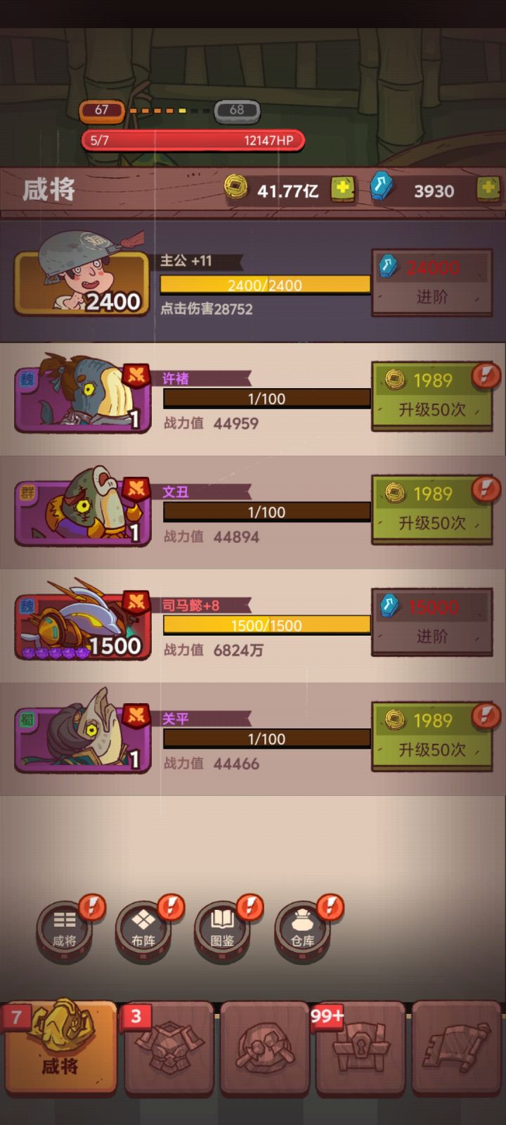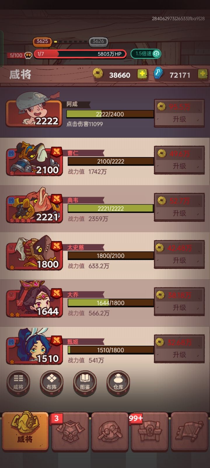 推塔越打8.5倍战力推塔更新,目前最高越打12.5倍战力竞技越打2.2倍战力每日boss打自身战力17倍伤害——————前期推图阵容(有蔡文姬用一,没蔡文姬用二)一:吕布(前排)太史慈,蔡文姬(后排)二:吕布(前排)太史慈,张飞,徐晃(后排)——————前期推塔阵容(资源全给吕布,其他人保持750级,吕布装备升满,多余的装备全给郭嘉,其次给夏侯)公孙瓒,夏侯惇(前排,公