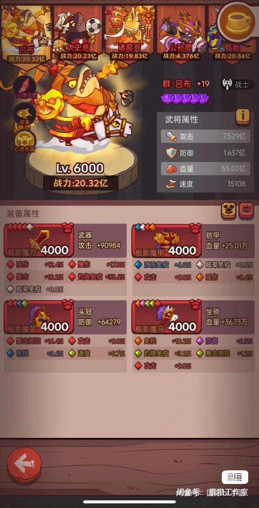 这个阵容适合大部分人前期过渡,起来后用后面几套,可以参考我这个战力可以打7800w的咸王(需要刷好多次基本我也就刷7400,这次的我也很意外);俱乐部会比咸王高几百万;主姜维副孙策,孙策你拉多点也可以会打的更疼,我资源不多就没拉(切记要多刷几次,别怪我没说,还有就是不适合大佬,大佬有需求,往下面看,下面有合适的)最后一点五号位贾诩可以换成黄月英或者诸葛亮,但是伤害差了点,贾>黄>诸葛,就这么个伤