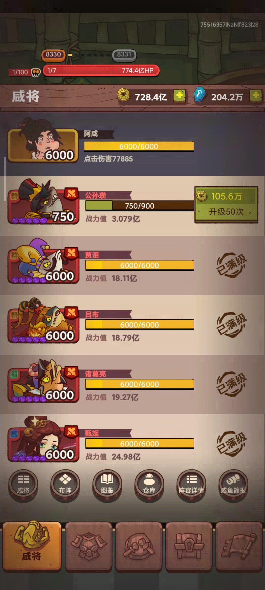 华佗,红张角,贾诩,橙张角,太史慈。一局3-4找伤害不是梦。 #咸鱼之王攻略